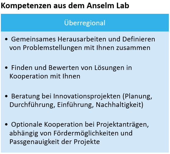 Gleichzeitig ist das Anselm Lab ein Ort, an dem Sie sich von innovativen Technologien inspirieren lassen und diese gegebenenfalls ausprobieren können. Gleichzeitig bieten wir mit ersten Bildungsangeboten im Umgang mit digitalen Medien wie Handys, Tablets oder Laptops Unterstützung vor Ort an. Wenden Sie sich bei Fragen gerne an das Team des Anselm Labs.